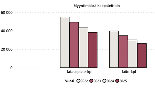 Kiinteistöihin asennettavia sähköautojen latauslaitteita myytiin viime vuonna 26 513 kappaletta, mikä on 13 prosenttia vähemmän kuin vuotta aiemmin, kertoo Sähköteknisen kaupan liiton (STK) tilasto.