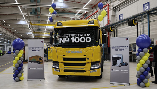 Kesällä 2023 Scania perusti tuotantolinjan sähkötoimisille kuorma-autoilleen Ruotsin Södertäljen tehtaassa. Matkalla on ollut monta vaikeutta, mutta 15. huhtikuuta 2026 luovutettiin 1000. sähkö-Scania ostajalleen, Falkenlevs Logistik-yhtiölle Ruotsissa.