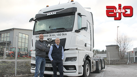 Myyntijohtaja Tuomas Viren ja toimitusjohtaja Jarkko Ketola. Taustana on pitkän takuun MAN TGX 26.520 takateliveturi.