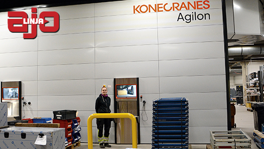 TMT Widnin Konecranes Agilon -varastoautomaatti Lahden toimitiloissa naamioituu vaaleaksi seinäksi. Kuvassa varaston Raisa Kaija antaa mittakaavaa oikeanpuoleisen, heikosti erottuvan luukun vieressä. Luukun yläpuolisesta ruudusta pystyy ohjamaan varastoautomaattia.