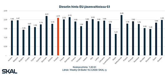 Viimeviikkoisen tilaston mukaan Suomi sijoittuu dieselin hinnassa EU-maiden vertailussa neljänneksi kalleimmaksi. Tilanne nostaa rajusti kuljetusyritysten kustannuksia, kuten SKALin esimerkkilaskelmat osoittavat.