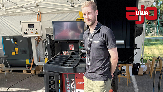 Wihurin Teknisen Kaupan aluepäällikkö Jesper Kieloaho ja nykyaikainen rengasnostimella varustettu Hunter HD Elite tasapainotuskone, amerikkalaisen Hunterin lippulaivamalli. Kuormitettuna tasapainotettavan pyörän suurin halkaisija voi olla 1 321 mm ja leveys 495 mm. Koneen veroton hinta on 17 000 €.